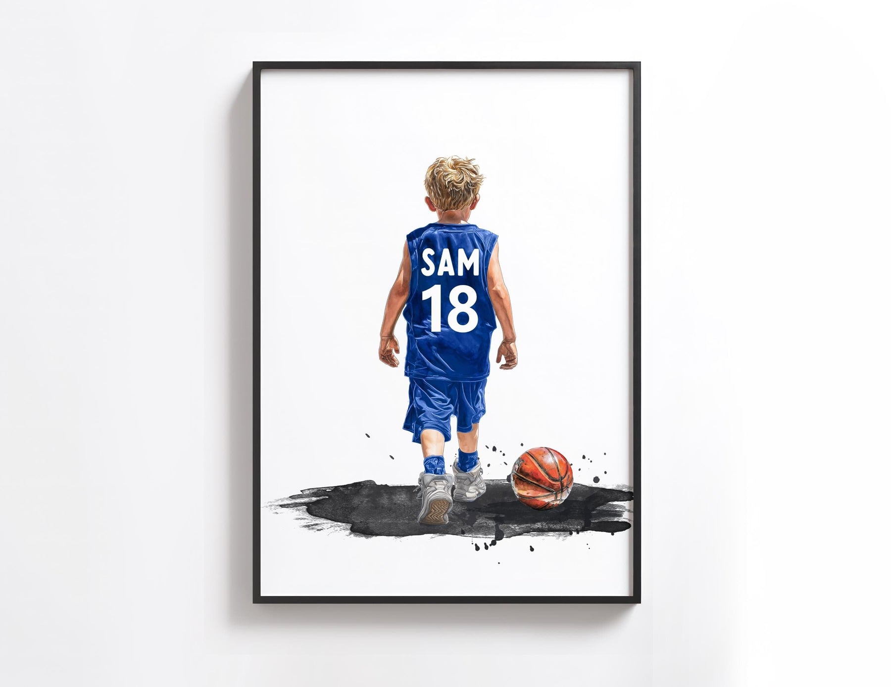 This artwork features a young basketball player walking with their ball — fully customizable with your child’s name, jersey color, and number. Perfect for boys’ rooms, sports-themed nurseries, game rooms, or as a thoughtful gift for young basketball fans and aspiring athletes.